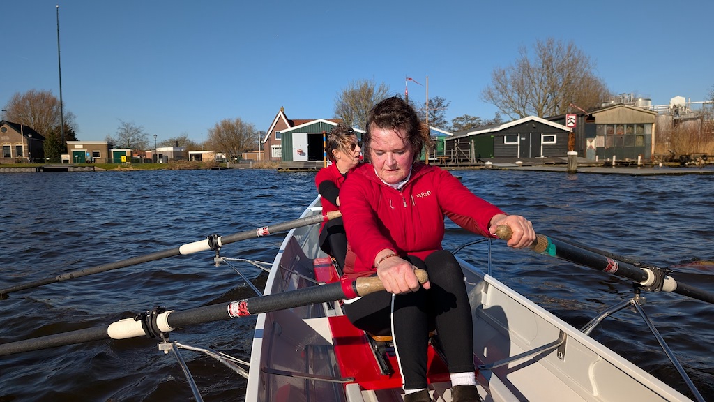 Elly (voorgrond) en Jolanda hard aan het roeien tijdens de podcast opname.