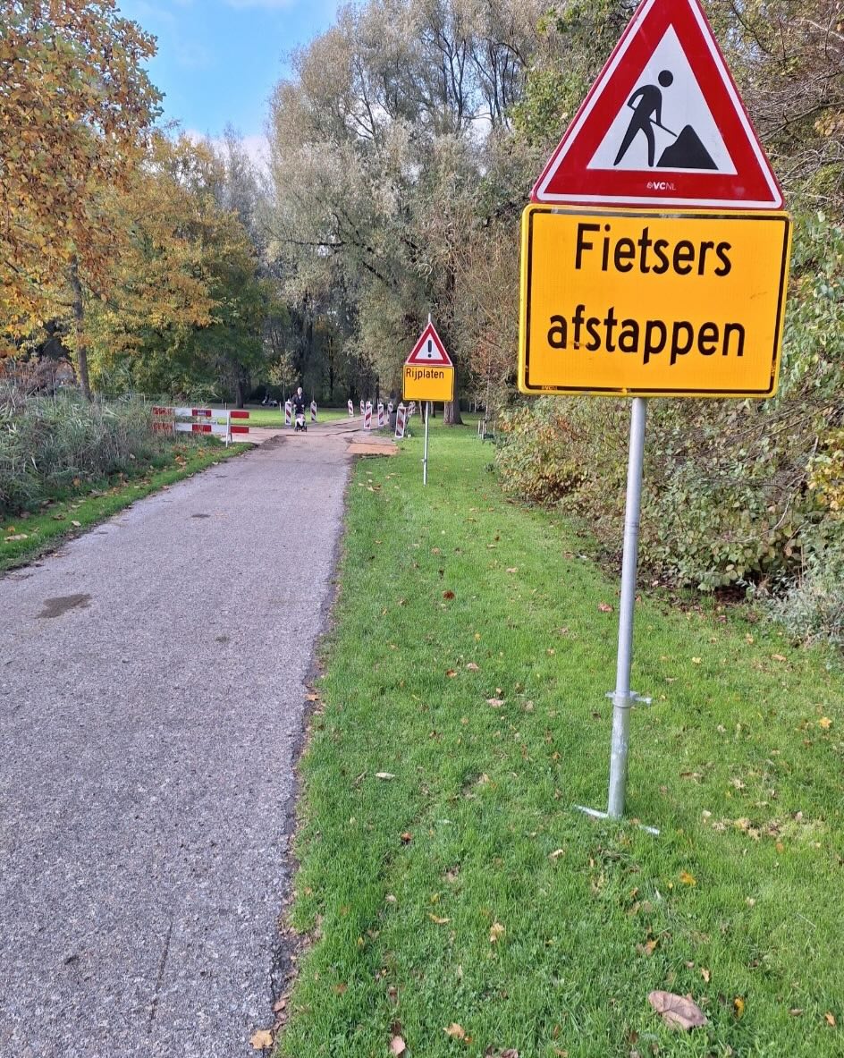 Het Darwinpark is een prachtig park waar je mag wandelen. Voetgangersgebied dus, alhoewel dit in de praktijk niet altijd blijkt te werken. Zaanstad beweegt daar soepel in mee, alhoewel ‘verwarrend’ een betere omschrijving is. De borden geven aan dat fietsers moeten afstappen, terwijl ze daar natuurlijk helemaal niet mochten opstappen.
