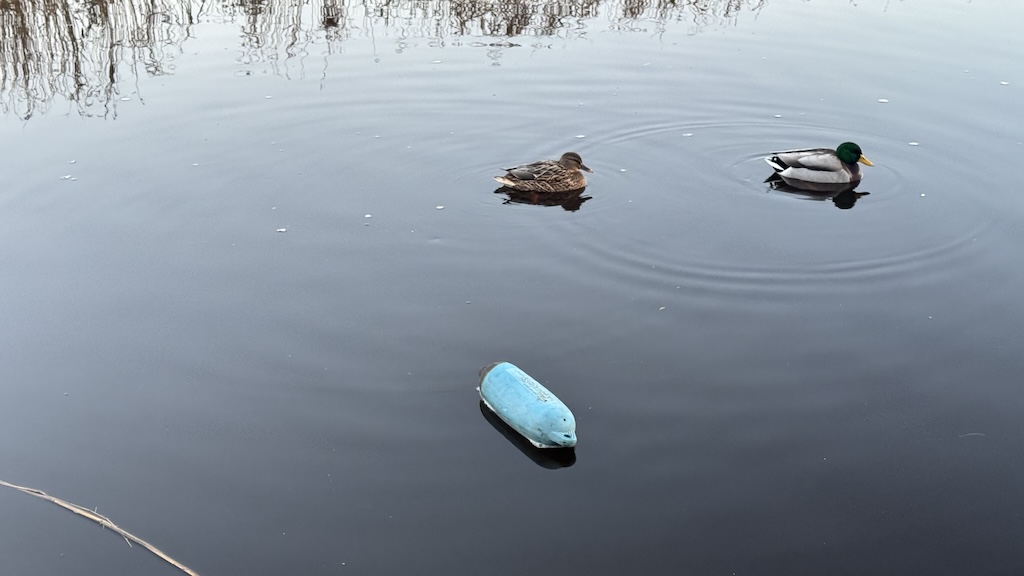 Het echtpaar zwemt erlangs. De man trapt op de rem. Zijn vrouwtje zit nog net niet met haar snavel in zijn kont. Zij keren zich naar het blauwe geval in hun sloot. Wat is dat? Zij zwemt eropaf en ziet dat het niet eetbaar is. Ze vervolgen hun weg. Boeie.