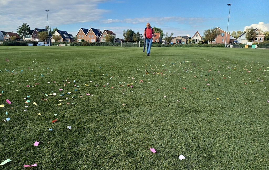 Aad Stam is al jaren fieldmanager bij Voetbalvereniging Knollendam. En in deze tijd dus vaak met een bladblazer in de weer. Niets bijzonders. Maar maandag moesten de vele herfstblaadjes toch even wachten. Het kunstgrasveld van de club bleek (na een feestje zondagmiddag) bezaaid met confetti. Geen probleem voor het erelid.