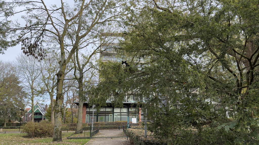 Op een mooie herfstdag kom je dit tafereel zomaar tegen in het Koogerpark. Op een tak van een boom zit een kat. Deze kat in de boom kijkt de kat uit de boom als hij/zij wordt gefotografeerd. Na de fotosessie besluit de kat af te dalen vanaf de hoge positie.
