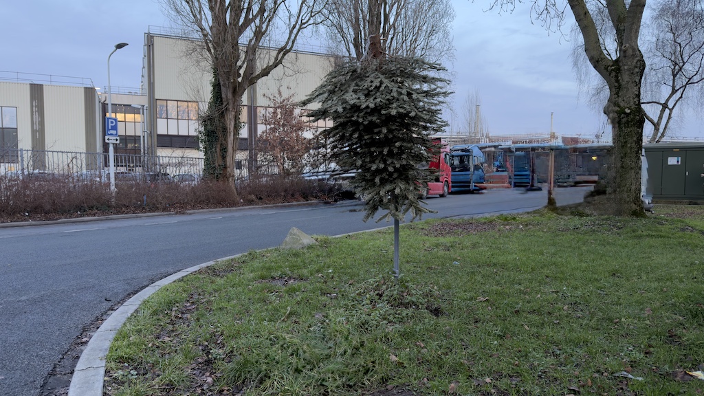Als je wandelt zie je wel eens opmerkelijke zaken. Neem bijvoorbeeld deze kerstboom. Die is kennelijk vergeten bij de ruiming eerder deze maand. Nu staat de boom op z’n kop. Geplaatst in een paal in het plantsoen. Ergens ook een grappig gezicht. De vraag is: haalt deze boom de kerst.