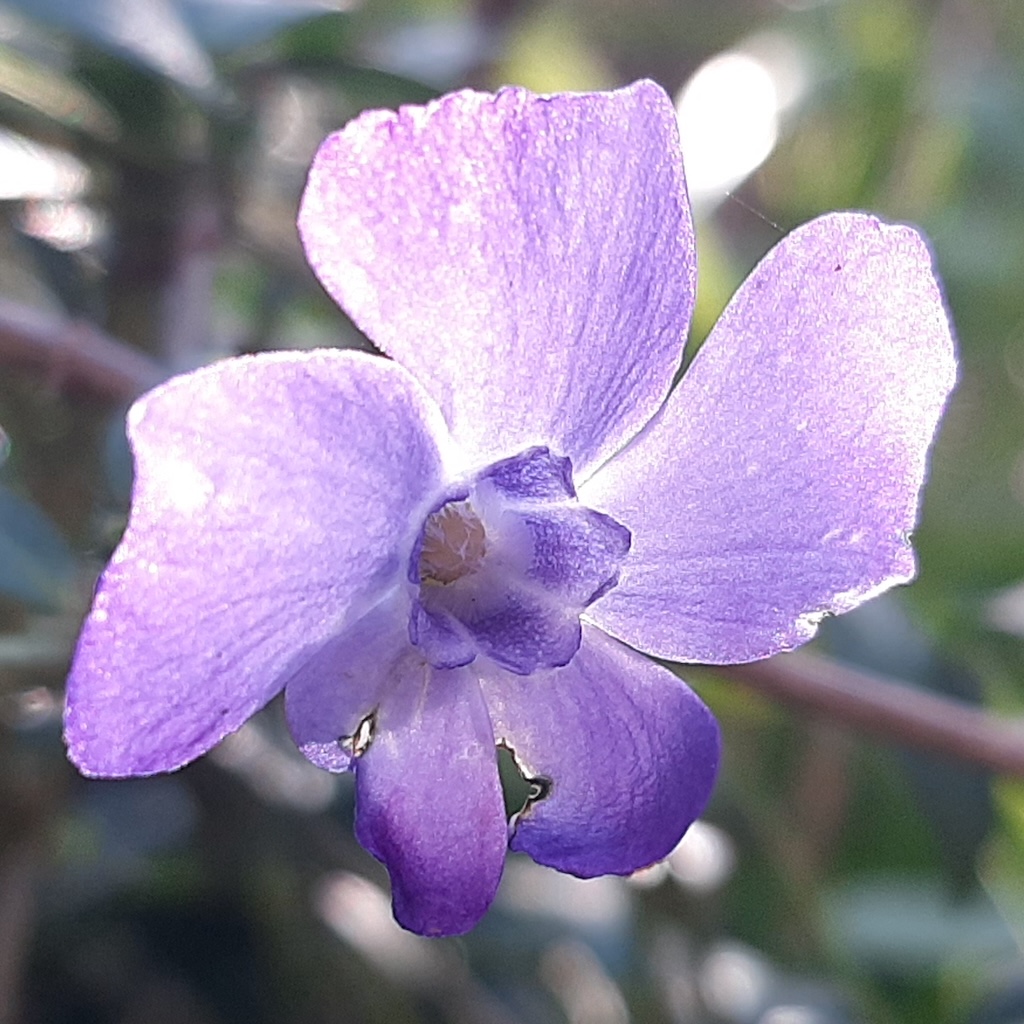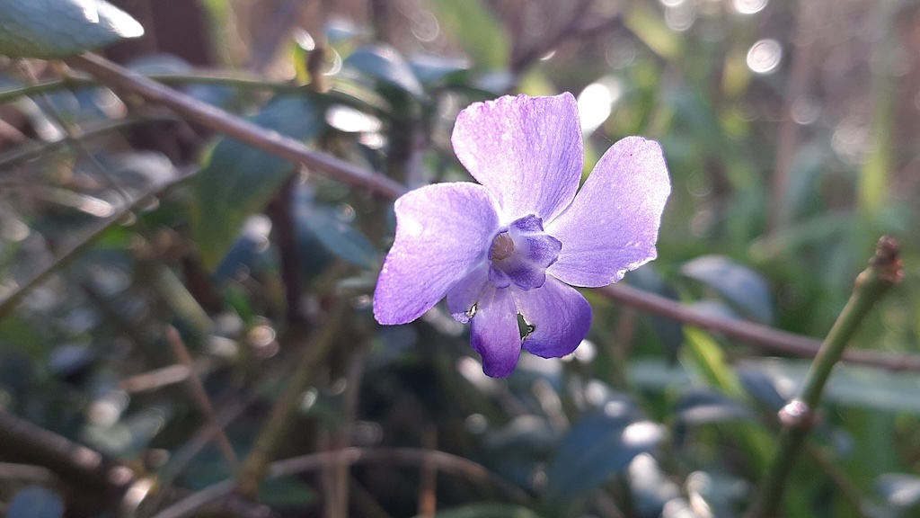 Na een paar grauwe dagen vorst en ijzige wind is de zon terug. De dagen lengen moet deze maagdenpalm gedacht hebben. Beetje vroeg zo tussen kerst en Nieuwjaarsdag. Een paar maanden vroeger dan normaal. Volgens Obsidentity is het de kleine maagdenpalm (Vinca minor), niet te verwarren met de Vinca major.