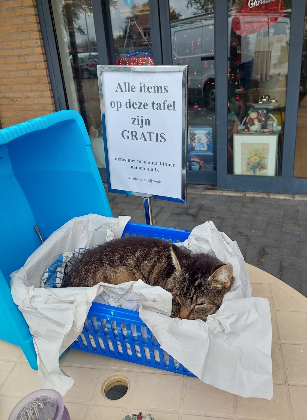 Inge Visser liep langs de heropende kringloop winkel / curiosazaak Alledaags Bijzonder aan de Westzanerdijk (de oude Aldi locatie). Net als bij het vorige pand heeft de vriendelijke uitbater een tafel buiten waarop zaken staan die je gratis mag meenemen. Maar sommige items op die tafel zijn toch echt onbetaalbaar.