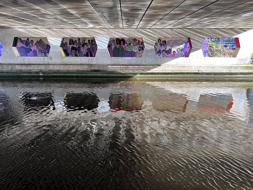 Onder de Anton de Kombrug weerspiegelt graffiti levendig in het water. De kunstwerken tonen gestileerde groepen mensen in paarse en gele tinten, gevangen in geometrische panelen langs de betonnen wand. Zonlicht valt door openingen, waardoor patronen ontstaan die serene, stedelijke sfeer versterken. Paarse vlakken doen denken aan nabij ontluikende krokussen.