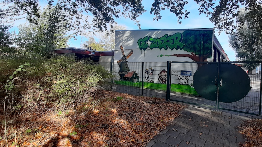 Op de zijmuur van basisschool De Zoeker in Rooswijk (Zaandijk) is de afgelopen zomervakantie deze vrolijke schildering aangebracht. Naast een autochtone koe, schaap en boom ook een aap (?) en een molen. Dat is De Zoeker, nu op de Zaanse Schans maar ooit stond deze aan de rand van Rooswijk.