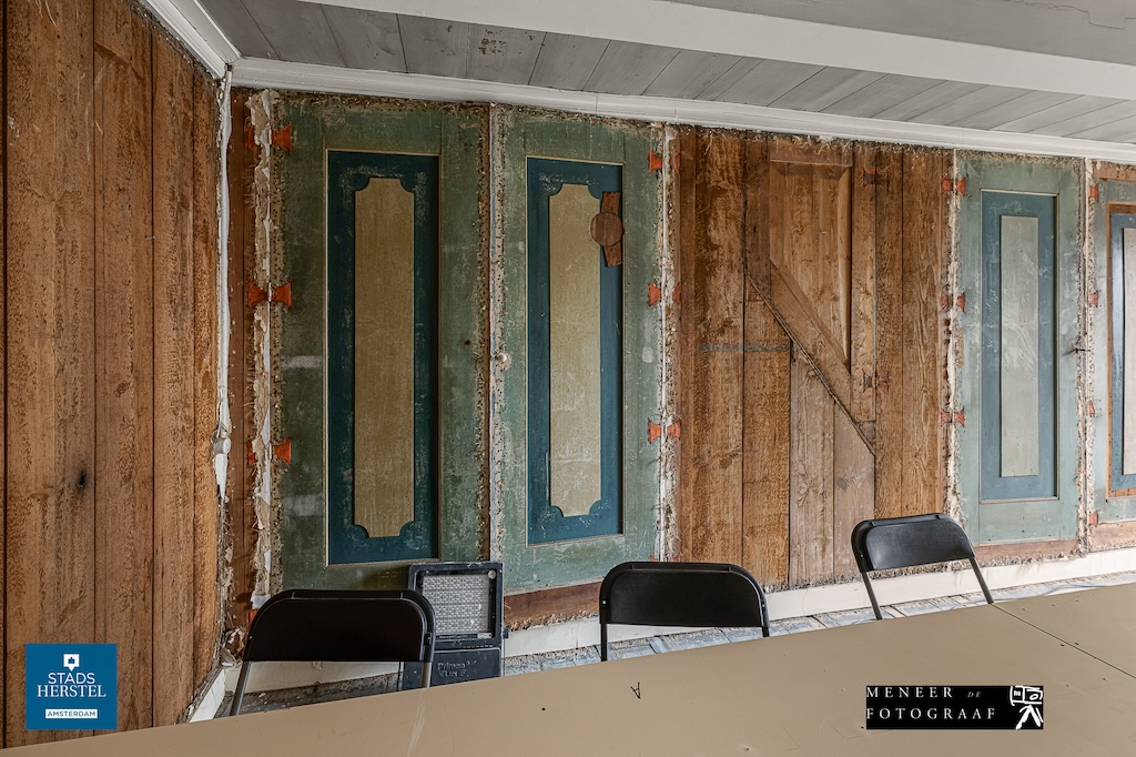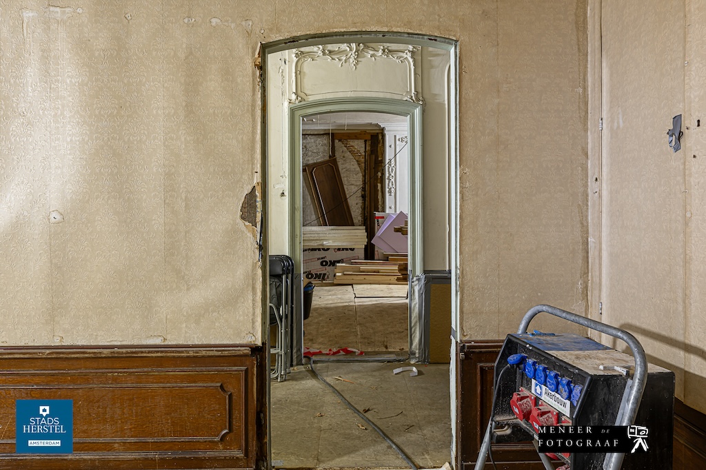 Wie nu naar binnen kijkt, ziet geen opgepoetst museumstuk maar een huis midden in zijn restauratie. Vloeren zijn deels opengelegd, behang bladdert, houtwerk wacht op herstel. Maar juist daardoor wordt zichtbaar wat dit pand zo bijzonder maakt.