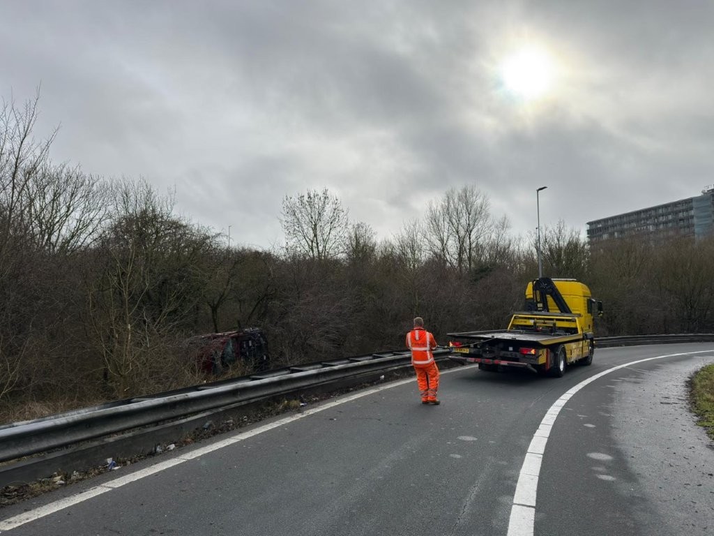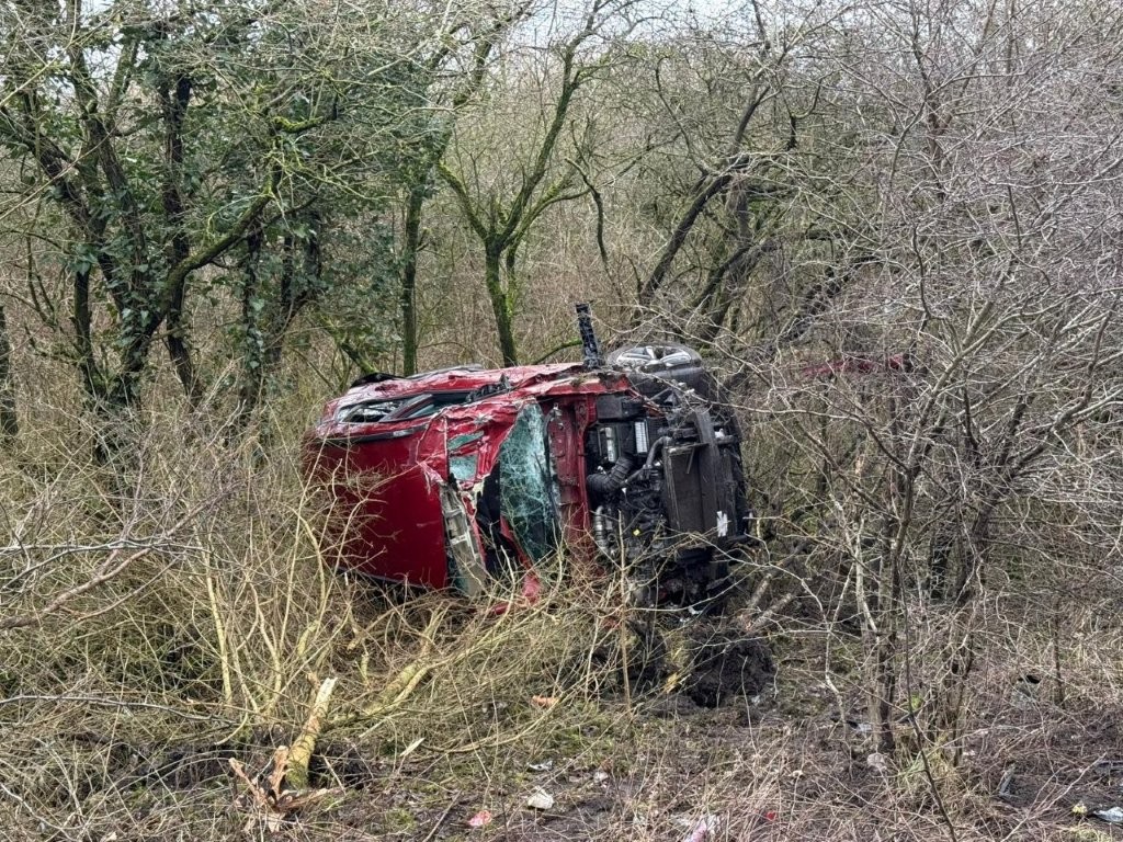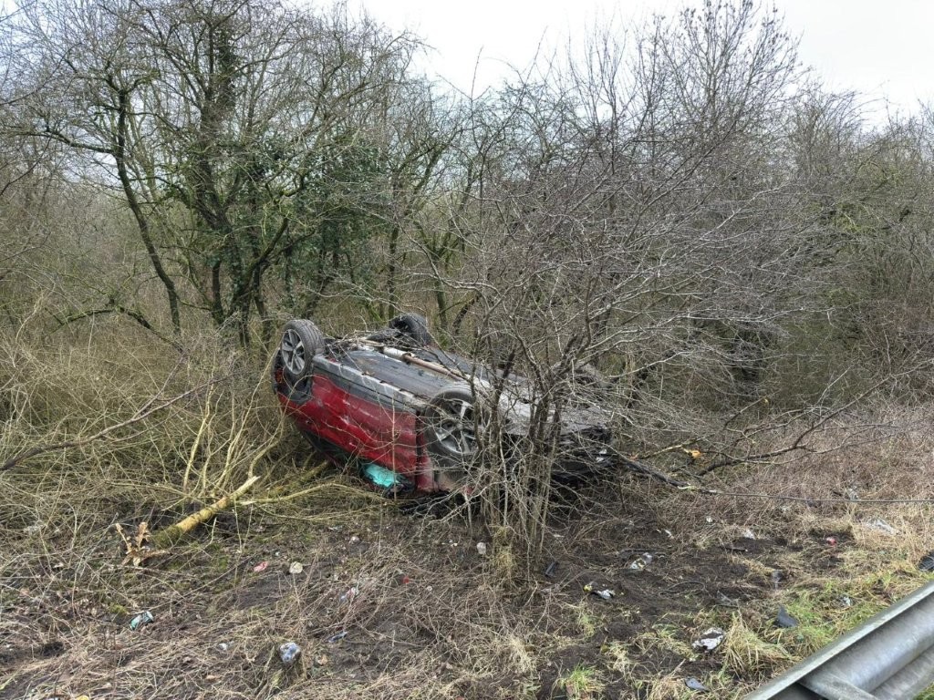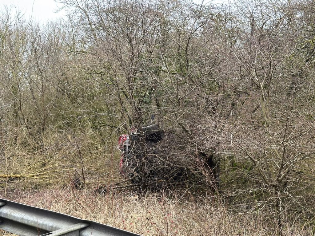 Op de afrit van de A8 naar de A7 in Zaandam is zondagmiddag – 22 februari – rond 13.35 uur een eenzijdig ongeval gebeurd. Een Hyundai Kona belandde ondersteboven tussen de bomen achter de vangrail.