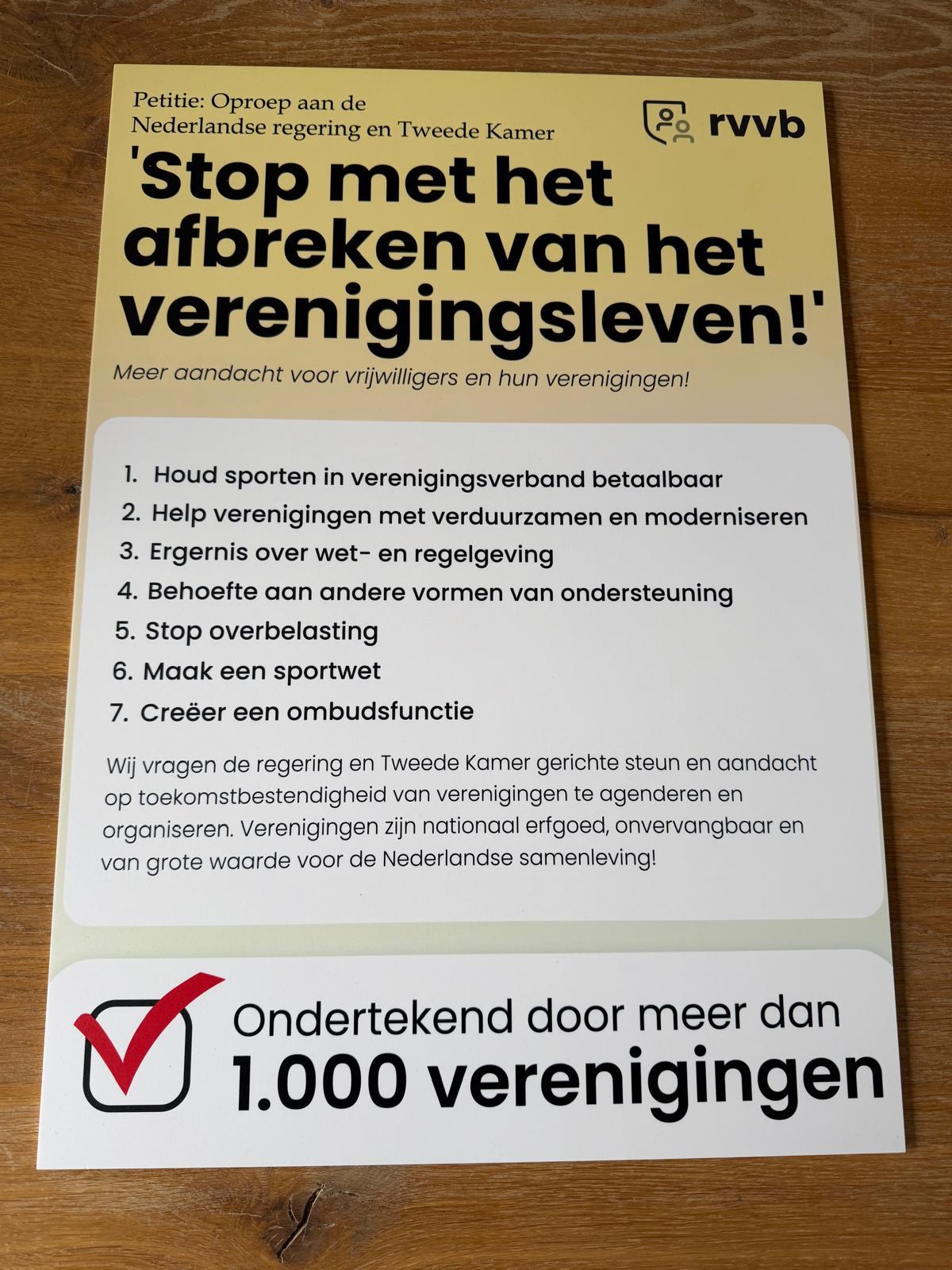 De petitie, aangeboden vanuit de RVVB (Register voor Verenigingsbestuurders), is door meer dan duizend verenigingen ondertekend. Die verenigingen roepen bijvoorbeeld op om sport betaalbaar te houden, de regeldruk voor bestuurders te verminderen en de positie van sport in de gemeentes vast te leggen in een Nationale Sportwet. Zo’n sportwet moet ervoor zorgen dat de verenigingen niet zomaar het slachtoffer worden van gemeentelijke bezuinigingen.