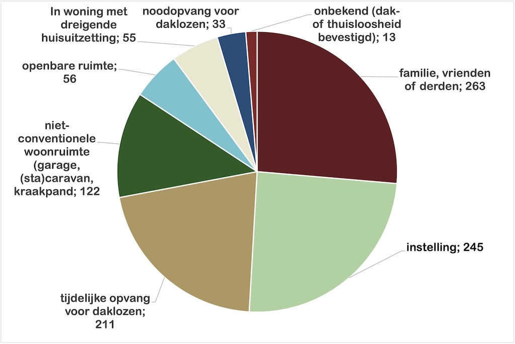 De telling werd gehouden via de ETHOS-methode waarbij dakloosheid wordt gezien als een gebrek aan volwaardige huisvesting. Het gaat dan niet alleen om mensen die bijvoorbeeld buiten of in hun auto slapen. Ook een grote groep mensen die geen veilige eigen plek hebben en bijvoorbeeld in opvanglocaties verblijven, zijn meegeteld.