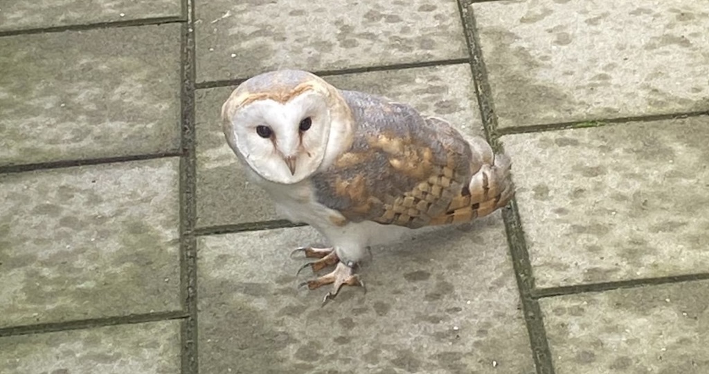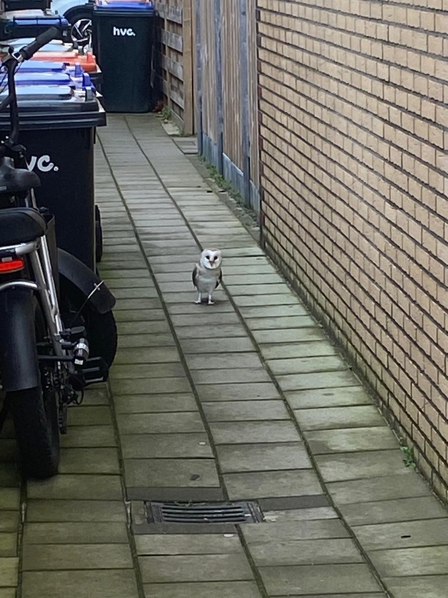 Een bijzondere ontmoeting gisterochtend op het Breedweer, tegenover sportcentrum De Wadden in Koog aan de Zaan: een kerkuil zat rustig op de stoep, midden in de woonwijk.