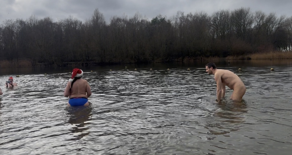 De zon liet zich vanmiddag rond 14.00 uur heel even zien, maar verdween alweer toen zo’n veertien bikkels het koude water van 6 graden verlieten.