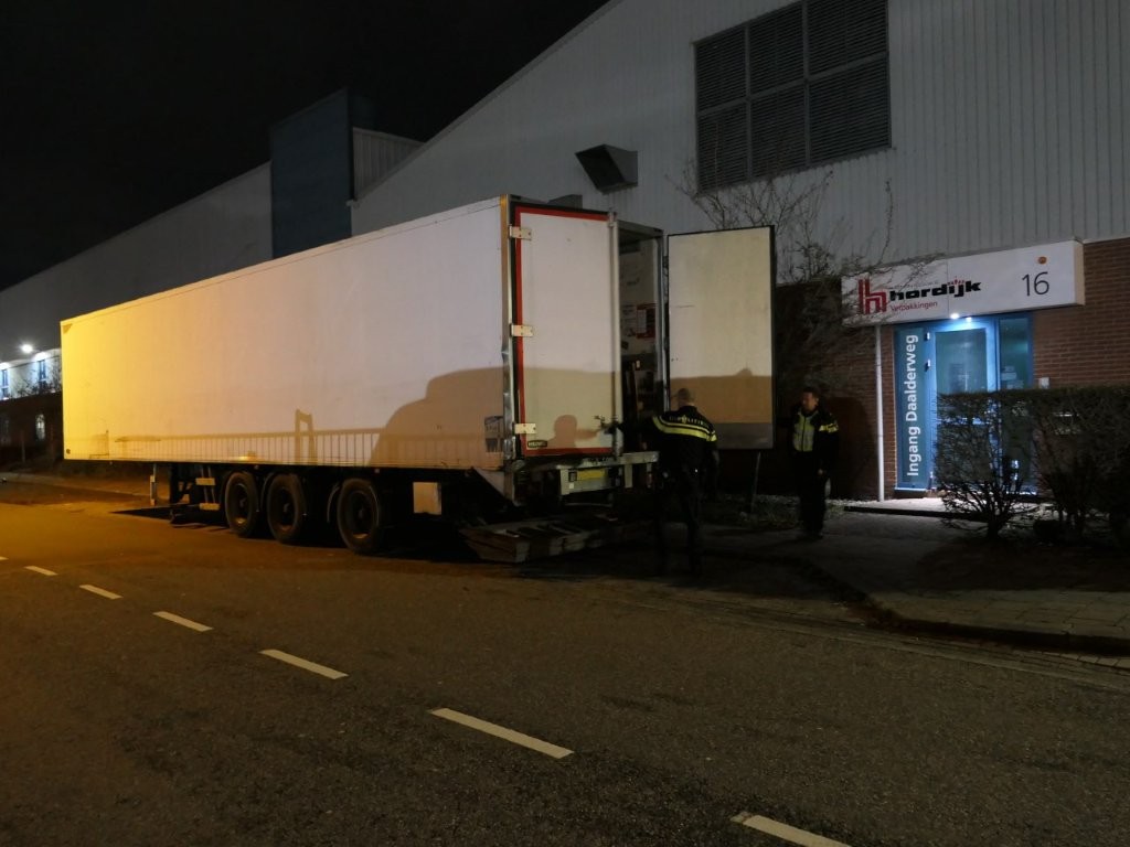 De oplegger werd aangetroffen door handhaving, waarna de politie werd ingeschakeld. Het bleek te gaan om een oplegger die als gestolen staat gesignaleerd. Deze is onttrokken uit een faillissement. Bij het openen van de laadruimte troffen agenten verschillende materialen aan, waaronder vloeistof, een blauw vat, een IBC container en meerdere stapels banden.