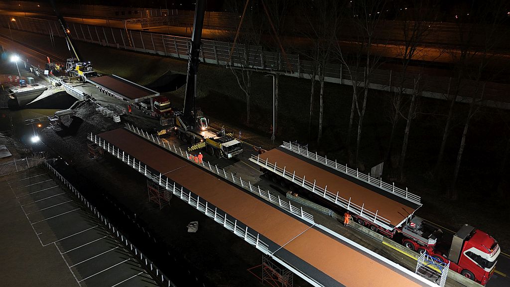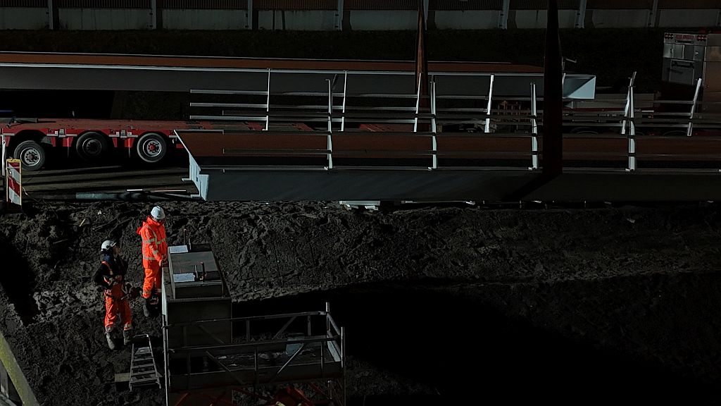 Elk brugdeel werd als kant-en-klaar onderdeel voorgereden op een dieplader. Vlak voor het hijsen werden nog even de hekjes aangebracht.