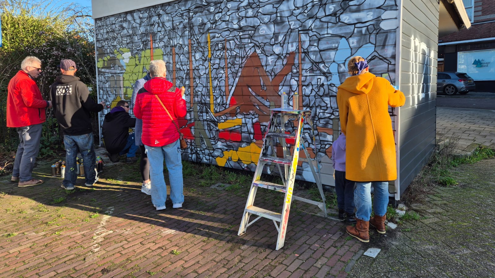 Onder een stralend zonnetje namen jong en oud de spuitbussen ter hand en ontstond langzaam het schilderij, tot tevredenheid van wijkmanager Ying Ho. Hij hoopt dat de verfactie eraan bijdraagt dat de kiosk wat meer gaat leven bij de buurtbewoners. En als straks ook de graffiti aan de zijkant van het gebouwtje weg is, komt de wens van Zaanstad om van de Burchtkiosk het kloppend hart van de buurt te maken weer een stukje dichterbij.