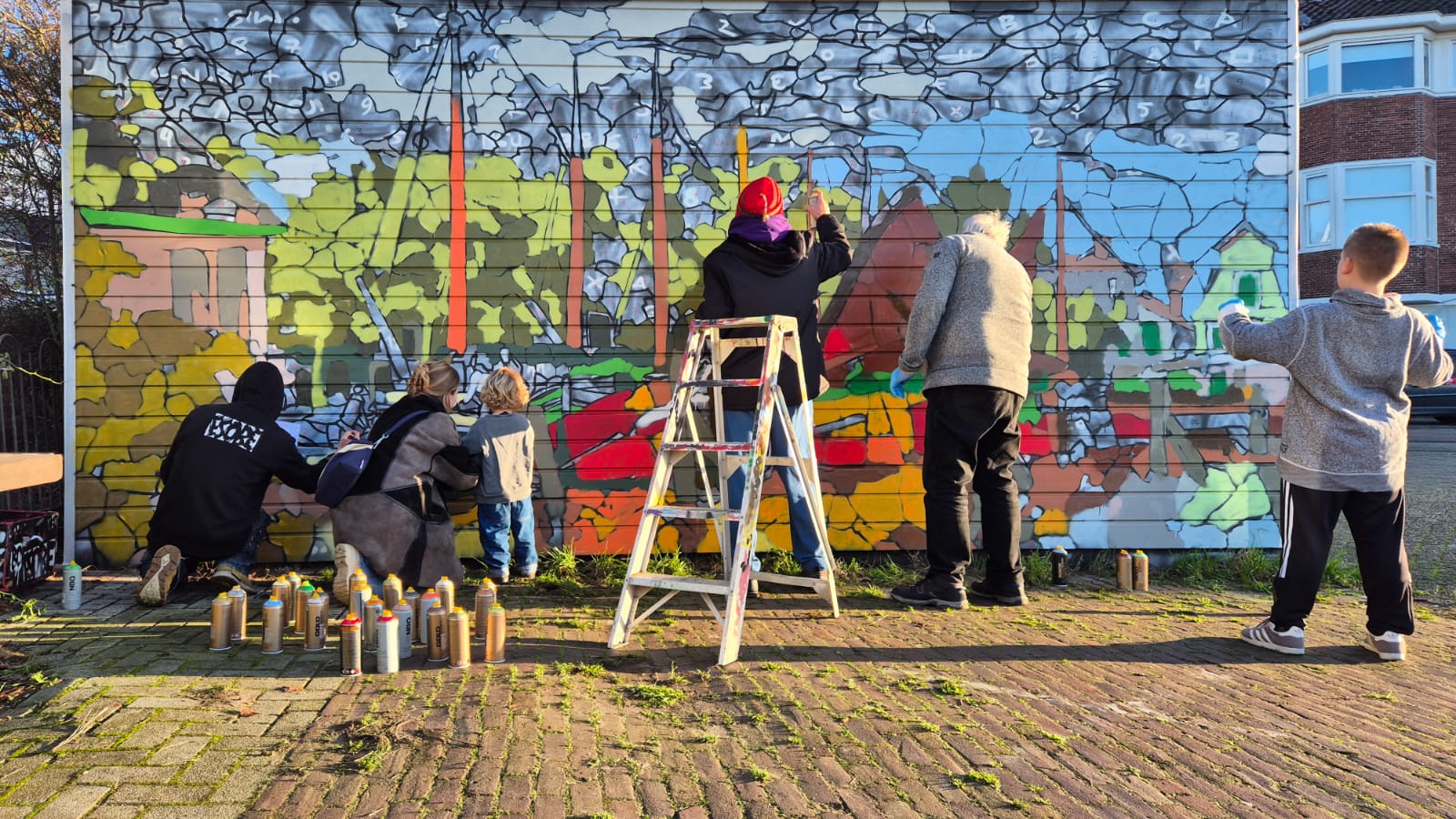 Onder een stralend zonnetje namen jong en oud de spuitbussen ter hand en ontstond langzaam het schilderij, tot tevredenheid van wijkmanager Ying Ho. Hij hoopt dat de verfactie eraan bijdraagt dat de kiosk wat meer gaat leven bij de buurtbewoners. En als straks ook de graffiti aan de zijkant van het gebouwtje weg is, komt de wens van Zaanstad om van de Burchtkiosk het kloppend hart van de buurt te maken weer een stukje dichterbij.