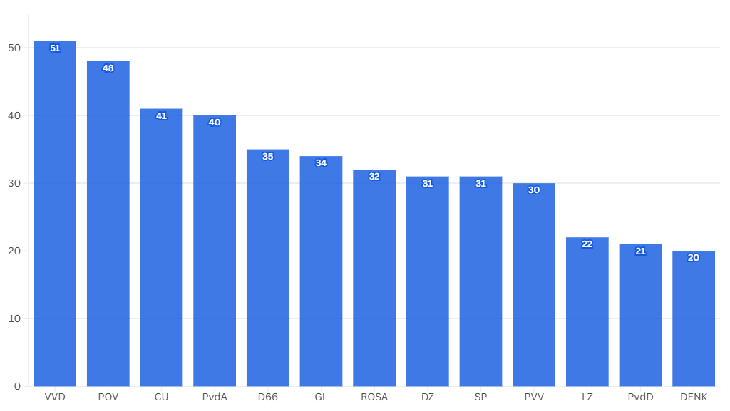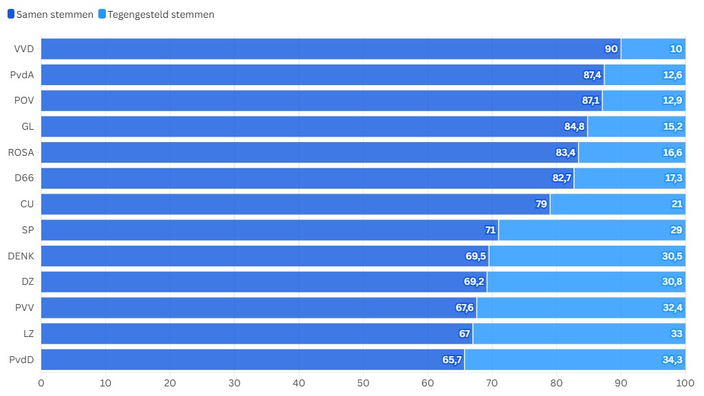 Dat de coalitiepartijen zó hoog staan, komt deels door de raadsvoorstellen; daar stemmen coalitiepartijen (en D66) bijna altijd vóór. Maar ook bij moties en amendementen houden de coalitiepartijen elkaar in beperktere mate vast. De PvdD staat helemaal onderaan de lijst; die partij is het het minst vaak eens met de christendemocraten.