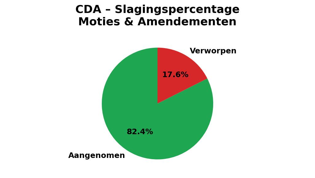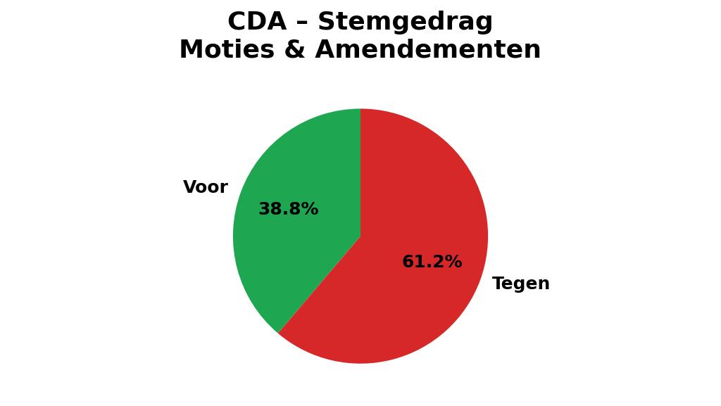 Voor amendementen en moties van andere partijen was de partij minder lief. Het CDA stemde tegen 61,2 procent van de moties en amendementen en voor 38,8 procent. De voorstellen die het CDA zelf (mee)indiende, zitten daar ook bij. Alleen de VVD stemde vaker tegen dan de christendemocraten.