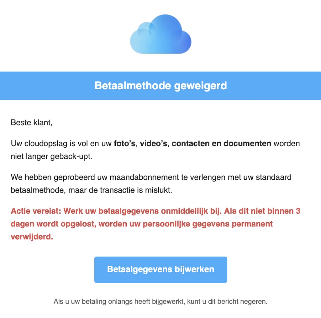 Het gaat om ‘Cloud Storage’ volgens de mail, het logo is van Apple’s iCloud. De verzender is iemand anders trouwens: ’thecraftystore’, gevestigd in India. De website staat bij stckg.blob – klinkt betrouwbaar. Wij zouden het niet doen.