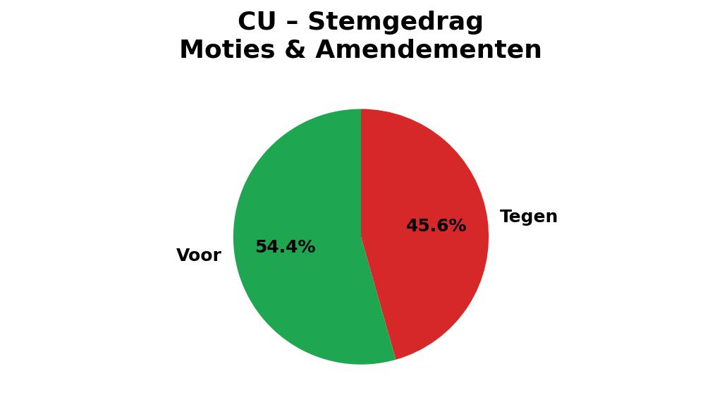 Voor amendementen en moties van andere partijen was de partij iets minder lief. De CU stemde tegen 45,6 procent van de moties en amendementen en voor 54,4 procent.  De voorstellen die de CU zelf (mee)indiende, zitten daar ook bij.