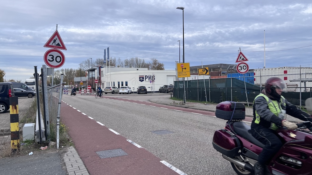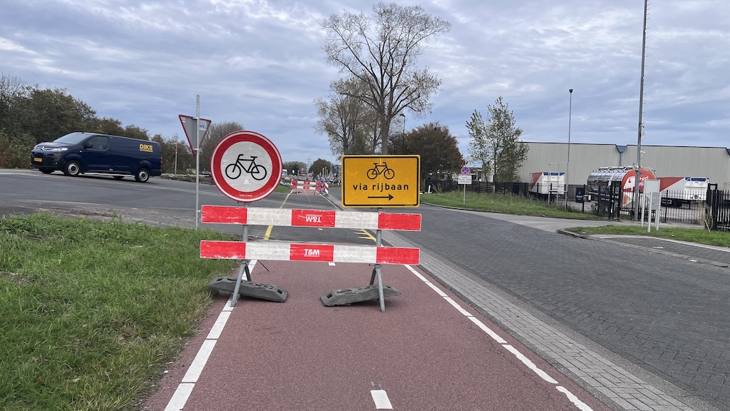 In de Achtersluispolder duurt het omrijden voor fietsers nog een weekje. Wel een kwestie van opletten, eerst de rijweg op en dan via het parkeerterrein de Sluispolderweg oversteken, altijd een uitdaging. Dan via het Brandegat en de bypass weer de Noorder IJ- en Zeedijk op. Zweetdruppels! 20 calorieën!