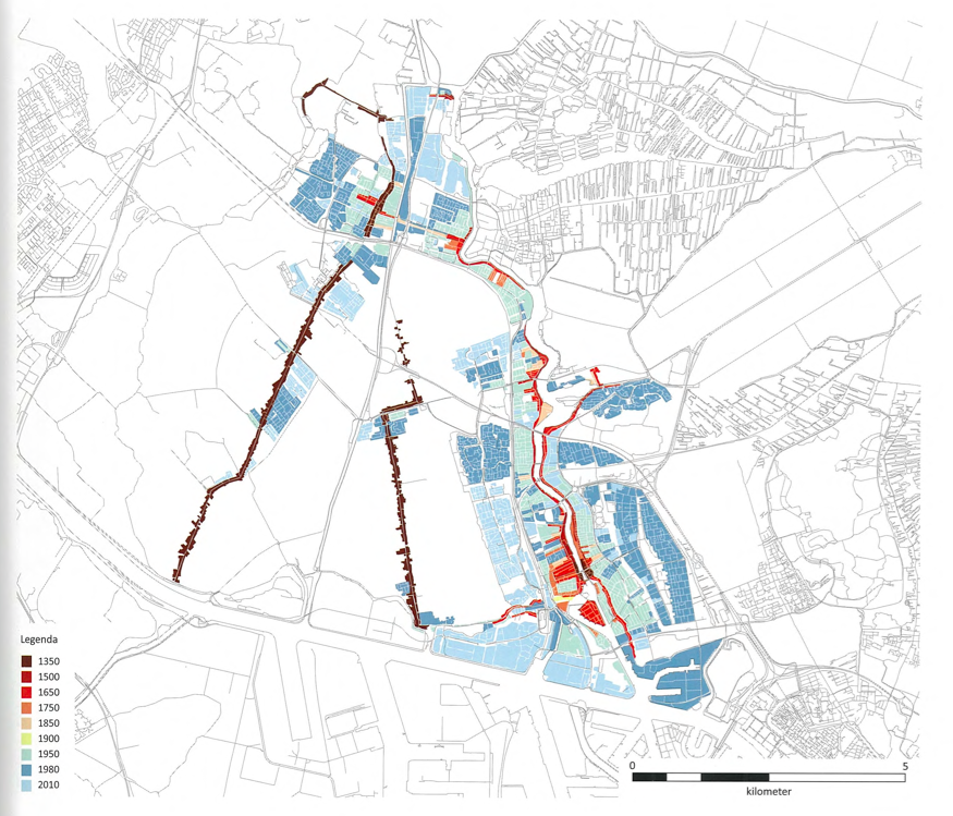 De rode gebieden langs de Zaan komen in de 16e en 17e eeuw tot ontwikkeling.