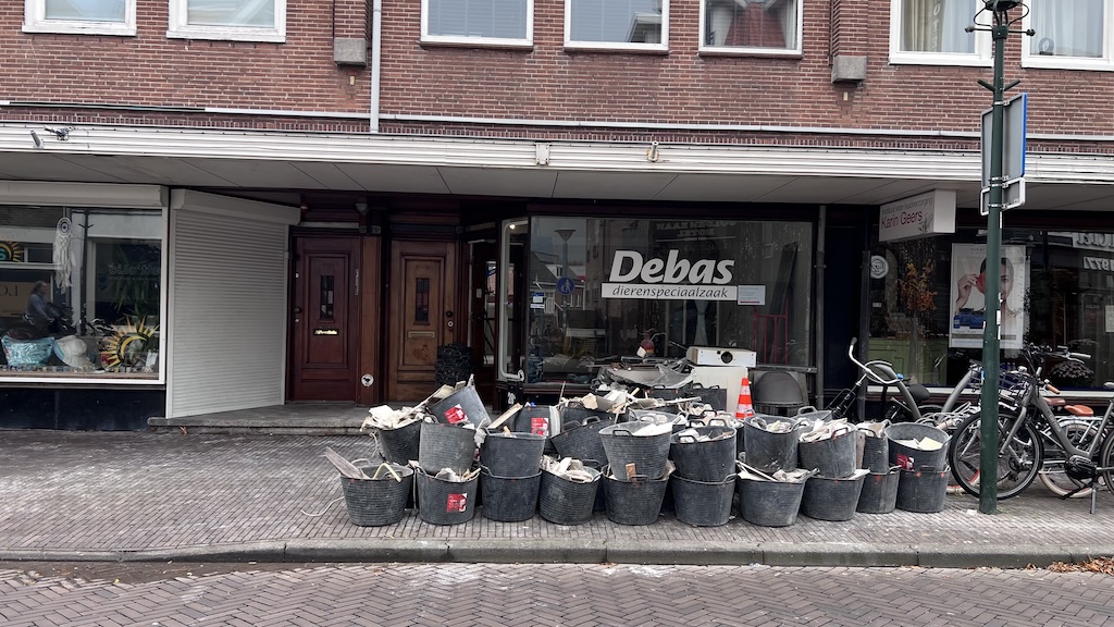 De winkel is leeg, zakken met bouwafval staan voor de deur. Alleen de naam op het etalageraam herinnert nog aan het verleden: Debas Dierenspeciaalzaak.