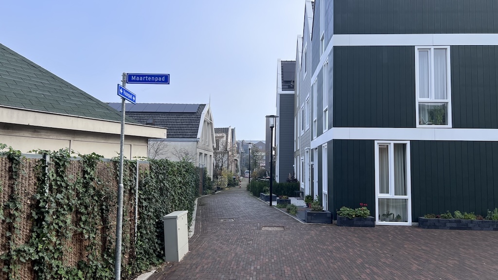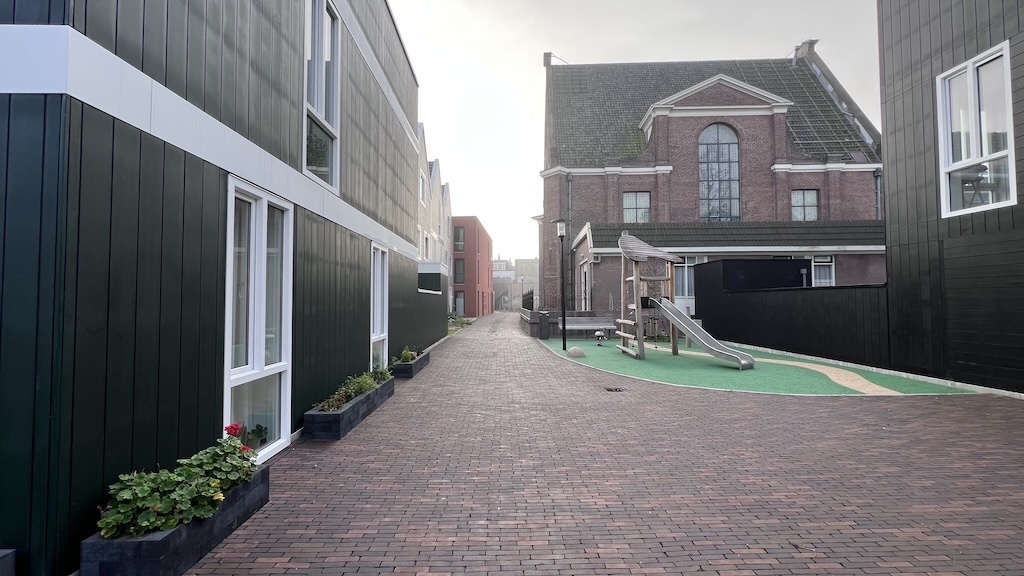 Onder en boven de foto’s van deze ‘shortcut’, de nieuwbouw van het Hazenleger (laatste woningen begin 2025 opgeleverd), het contrast met de Maartenkerk (1699) en de nieuwe speelplek.