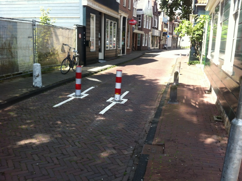 Sterker nog: soms is de oplossing erger dan de kwaal. Op de Hogendijk richting Dam (Zaandam) zijn de drie kleine paaltjes vervangen (onder) door twee massieve metalen palen en één betonnen paal (nieuwe situatie boven).