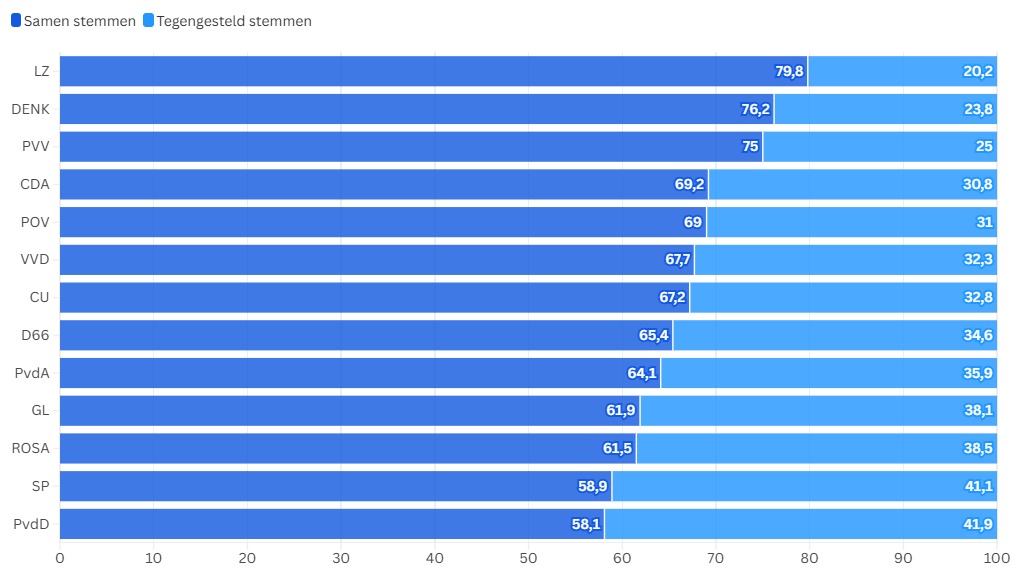 Als we ook de raadsvoorstellen en overige stemmomenten erbij optellen, krijgen we een totaalbeeld van hoe vaak DZ hetzelfde stemt als de andere partijen in de Zaanse gemeenteraad. Dan zien we dat DZ het vaakst hetzelfde stemt als de partij die van hen afsplitste, LZ, 79,8 procent van de keren. Deze partij wordt gevolgd door DENK en PVV.