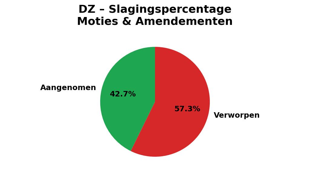 DZ stemde vaker voor dan tegen. 54,9 procent van de tijd zei de partij ja tegen een motie of amendement, 45,1 procent van de tijd nee. De voorstellen die DZ zelf (mee)indiende, zitten daar ook bij.