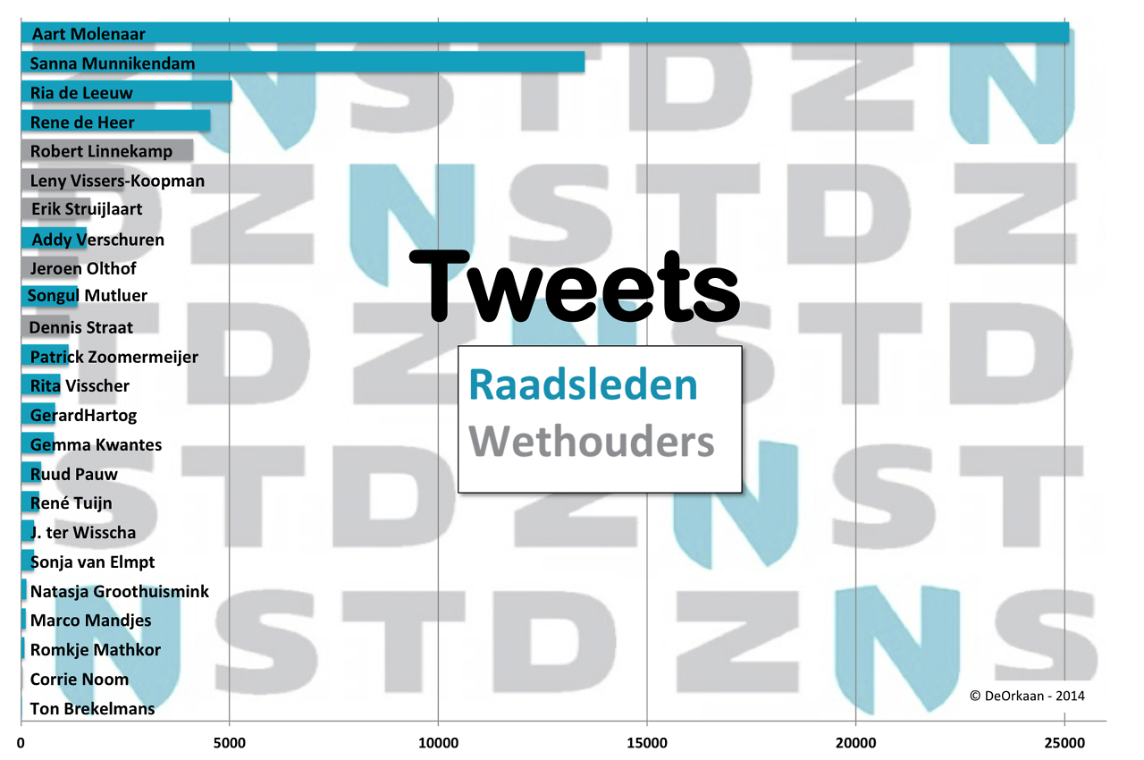 Gemiddeld stuurt DZ-fractievoorzitter Aart Molenaar 15 tweets per dag de wereld in. Totaal zijn dat er 25.000 in de afgelopen 4.5 jaar.