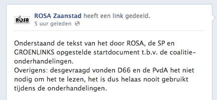 Wat hadden ROSA, GL en SP gewild? Zijn zijn vooral met zichzelf bezig geweest: een lijvig programma schrijven, waarvan het niet geheel duidelijk is de formateurs dat niet wilden lezen (ROSA-versie) of niet mochten lezen (coalitie-versie). Het is integraal op Facebook gepubliceerd.