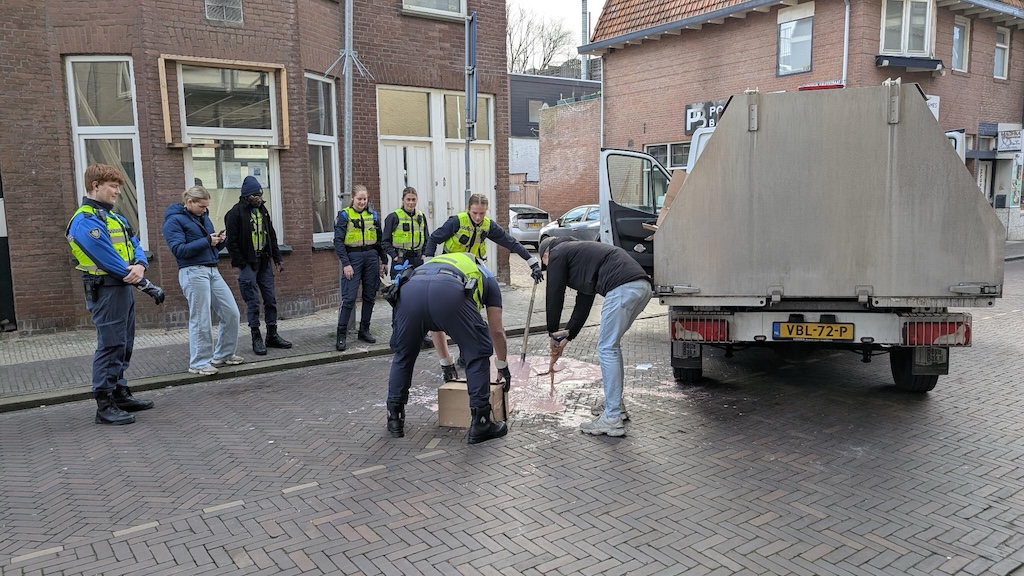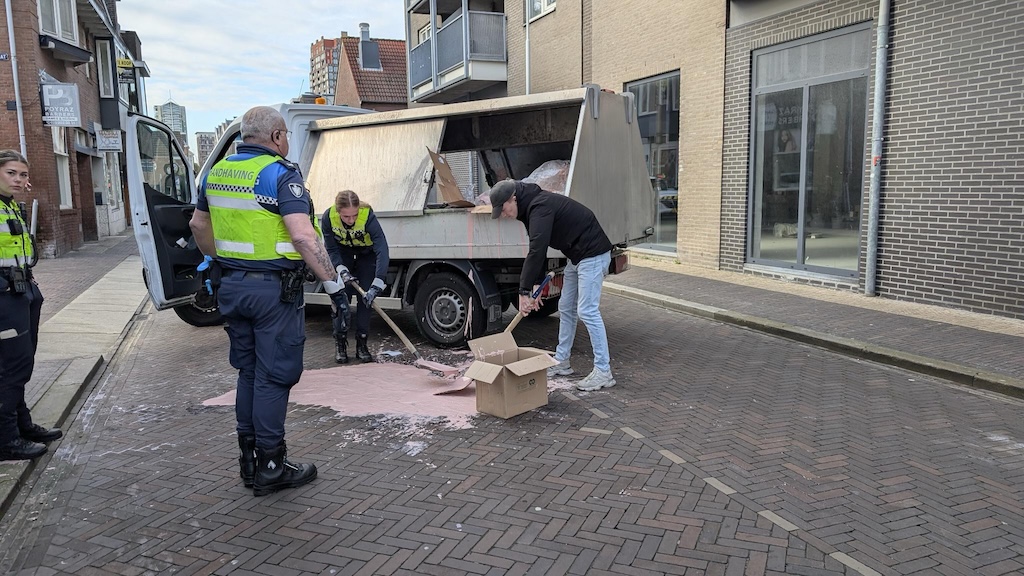 Handhaving was met minstens zes hesjes aanwezig om toezicht te houden en te assisteren bij het opscheppen van de verf.
