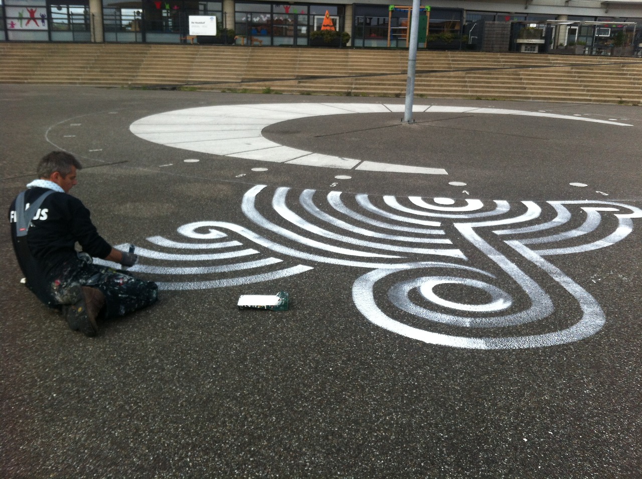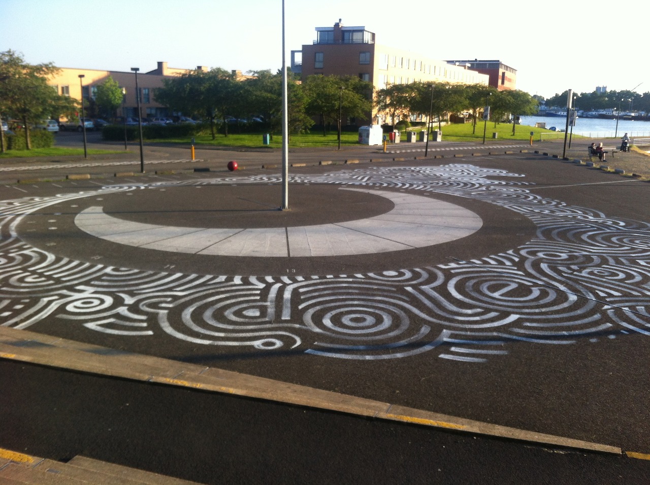 Kunstenaar Olivier Rijcken is donderdag begonnen met het aanbrengen van een enorme ‘doler‘ op het plein op het Eiland in Zaandam.