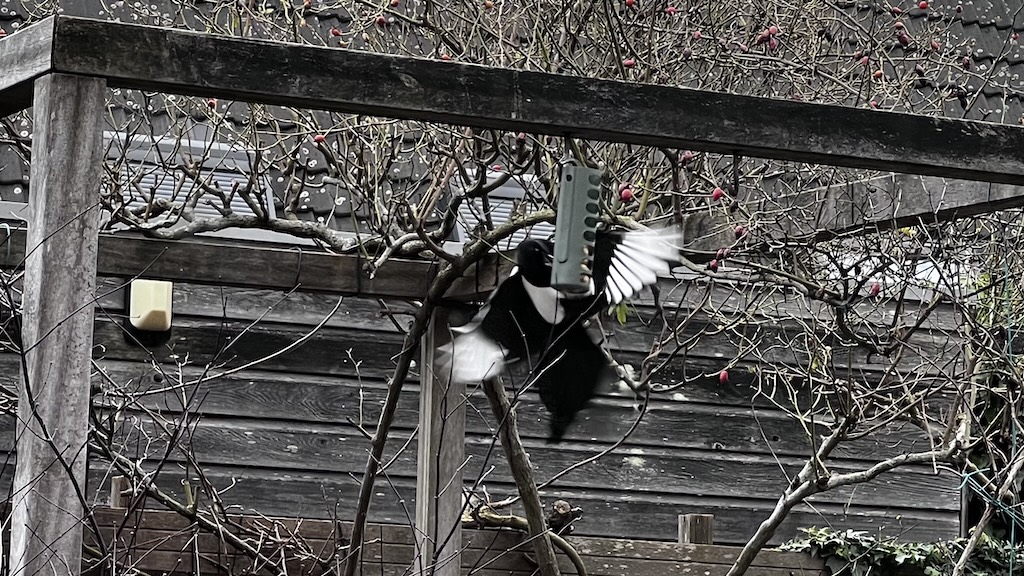 Binnen vijf minuten fladderde de eerste vogel de tuin binnen. Niks mees of mus. Maar een ekster (een Pica Pica – mooie naam). Rossini schreef daar een opera over: La gazza ladra (De diefachtige ekster) – ook wel als ‘stelende ekster’ vertaald, maar ‘diefachtige’ is natuurlijk mooier.