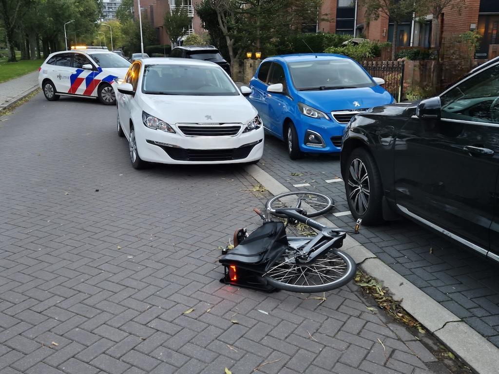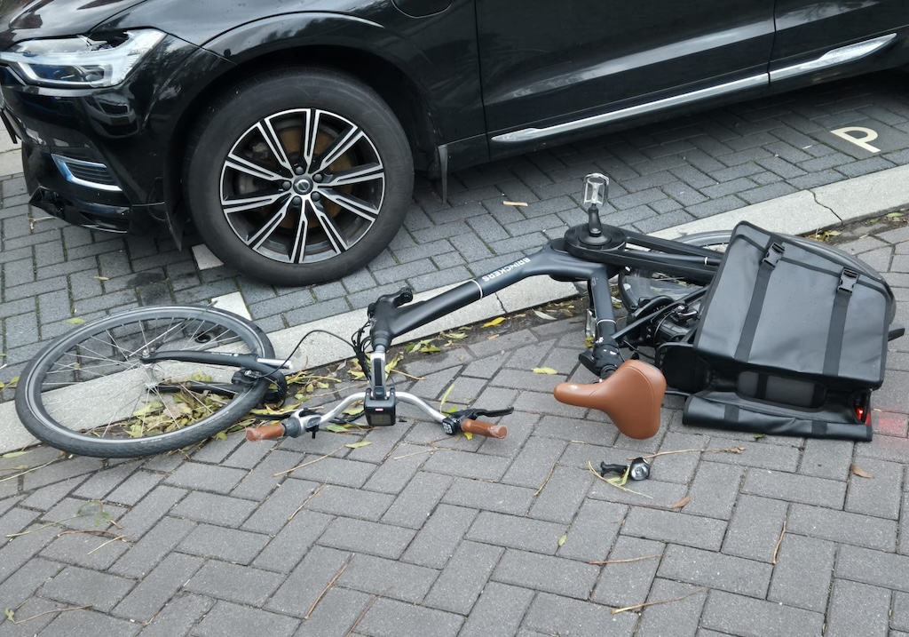 De klap was zo hard dat de voorvork van de fiets afbrak. De fiets belandde tegen een geparkeerde zwarte Volvo. Ook de witte Peugeot waarmee de fietser in botsing kwam, liep schade op.