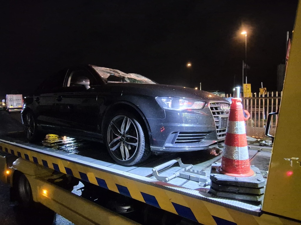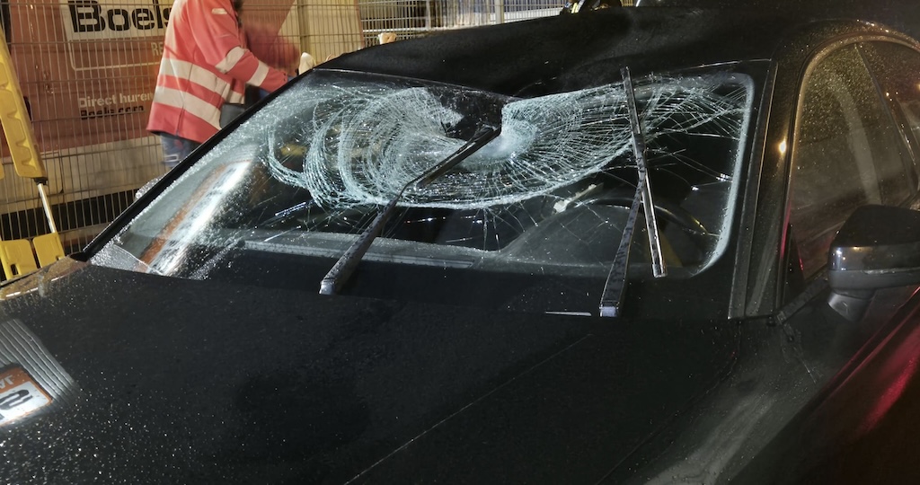 De auto raakte zwaar beschadigd aan het voorraam en dak.