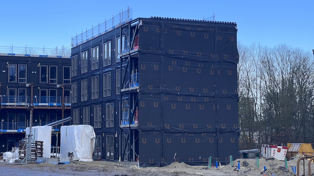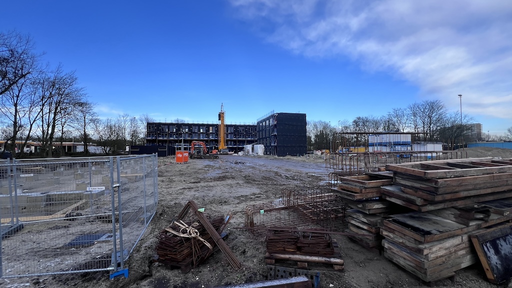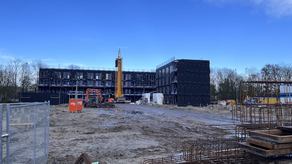 Twee woonblokken voor de tijdelijke flexwoningen op Sportpark Poelenburg staan er al. Modulair gebouwd in de fabriek en in Zaandam als Lego-stenen in elkaar gezet. De bouw begon in december 2025.