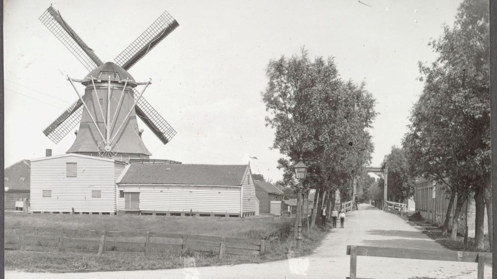 Vandaag in de fototijdreis nemen we je mee naar het einde van de Stationsstraat in Koog aan de Zaan met molen De Zwarte Bonsem.