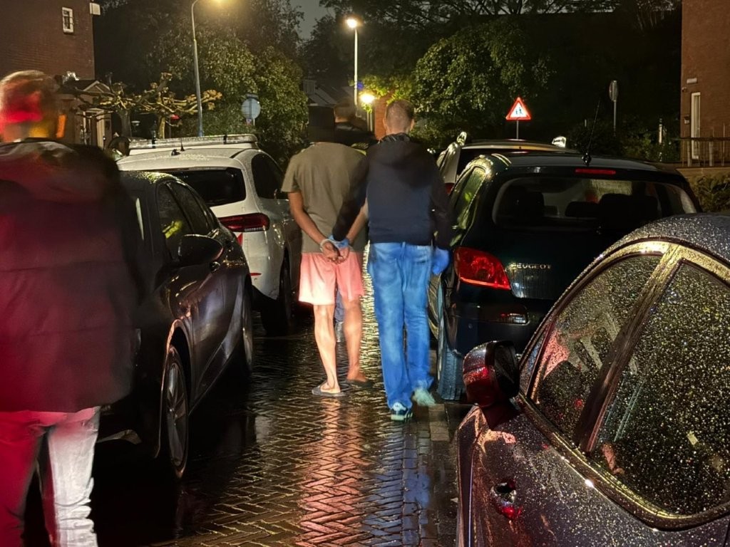 Twee mannen zijn aangehouden door de politie. Eén van hen droeg zogenoemde schietmouwen, waarmee sporen veiliggesteld kunnen worden. Een vrouw werd uit de woning meegenomen, vermoedelijk voor verhoor op het politiebureau.