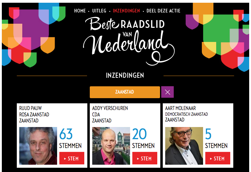 “onze collega Harrie van der Laan is voorgedragen als Beste raadslid van Nederland. Hier zijn wij natuurlijk erg blij mee. Stem allemaal, en wie weet ontvangt hij deze prijs.”