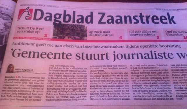 Verslaggever José Pietens van Dagblad Zaanstreek werd verzocht de openbare hoorzitting waarop de bezwaarmakers hun problemen zouden toelichten te verlaten – op verzoek van die bezwaarmakers (Linda Stellaart en haar man). Toen de verslaggever stelde dat het een openbare zitting was en dat ze alle recht had daar te blijven en niet van plan was te vertrekken, stelde Nelleke Zeef (afdelingshoofd Juridische Zaken van Zaanstad) dat de zitting in dat geval niet door zou gaan en dat ze wel “een andere manier” zou vinden om de bezwaarmakers te horen.