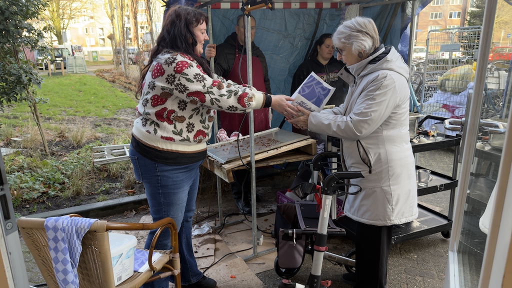 Net naast de hoofdingang van zorgcentrum Mennistenerf aan de H. Gerhardstraat in Zaandam stijgt een wolk op bij een klein tentje. In het tentje staat een soort grote friteuse. Daarin worden oliebollen met of zonder krenten gebakken door vader Jos en dochter Celeste.