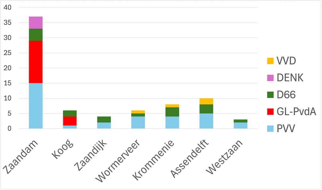 D66 was in drie stembureaus in Krommenie de grootste, de PVV in vier. De VVD haalde een meerderheid in één stemlokaal. In Assendelft waren vijf stembureaus voor de PVV, drie voor D66 en twee voor de VVD. In Westzaan werd de strijd gewonnen door de PVV (twee stembureaus) tegen eentje voor D66.