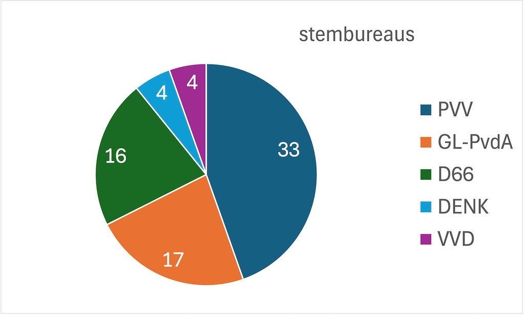 In totaal haalde de PVV in 33 stembureaus de meeste stemmen, GL-PvdA in 17, D66 in 16, de VVD en DENK in 4.