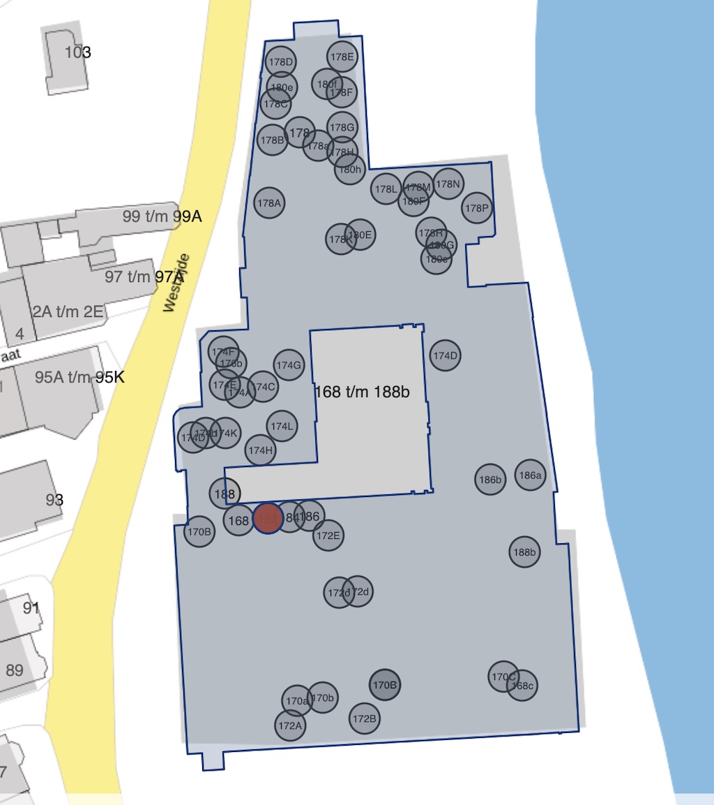 Bij het Kadaster bestaan overigens zowel 170 als 182b niet – wel 170a t/m C en 180 (zonder toevoeging – het rode stipje op de kaart hieronder). Inmiddels betrok wel de Groepspraktijk Westzijde een deel van de tweede verdieping.