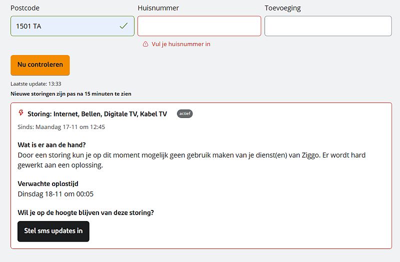 ‘Door een storing bij Ziggo kan ik al twee dagen niet thuiswerken. Ik woon in de Spoorbuurt in Zaandam. Ziggo meldt alleen dat er aan een oplossing wordt gewerkt, maar er is nog steeds geen herstel.’