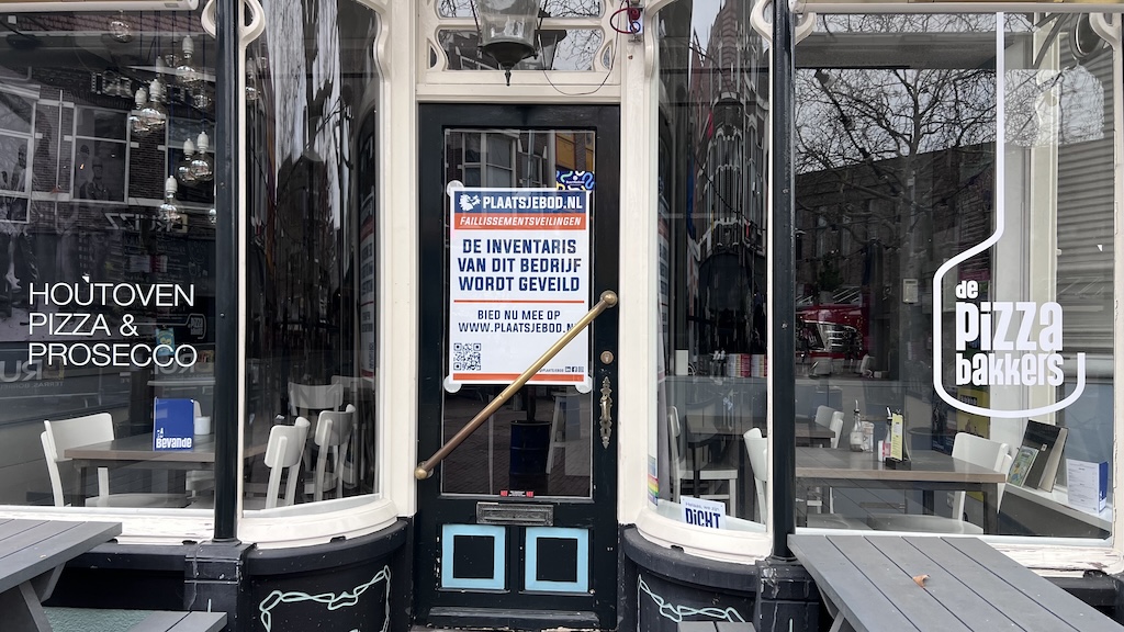 De inventaris van De Pizzabakkers aan de Dam in Zaandam wordt geveild. Het restaurant ging begin november failliet. De online veiling loopt tot dinsdag 30 december.