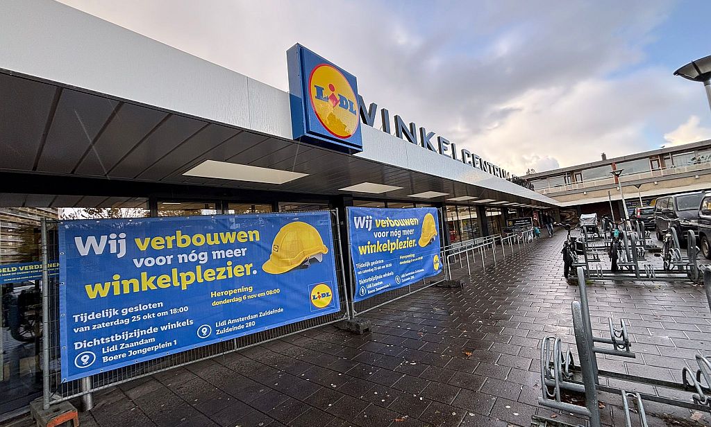 Supermarkt Lidl in winkelcentrum Gibraltar is tijdelijk dicht. Er wordt verbouwd, staat te lezen op grote zeildoeken bij de winkel in Zaandam.